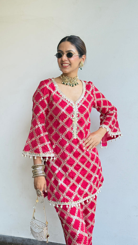 This co-ord set is a the perfect pick for any festive occassion. The kurta has delicate gota embroidery all over, with funky bell sleeves and pearl/ mirror details. The outfit is just right for sparkly day events, and also for those dreamy, special evenings!
