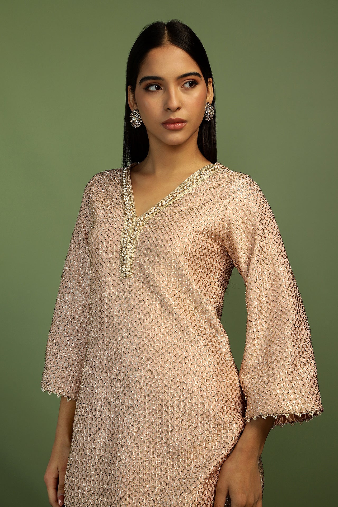 This set features a delicate and glittery kurti with gota and pearl details on a delicate gold tissue base. The neck is accentuated with pretty pearls. The pants are embroidered with a sprinkle of beads and zari on gold tissue. Simple and sophisticated, this could be your next go to outfit!