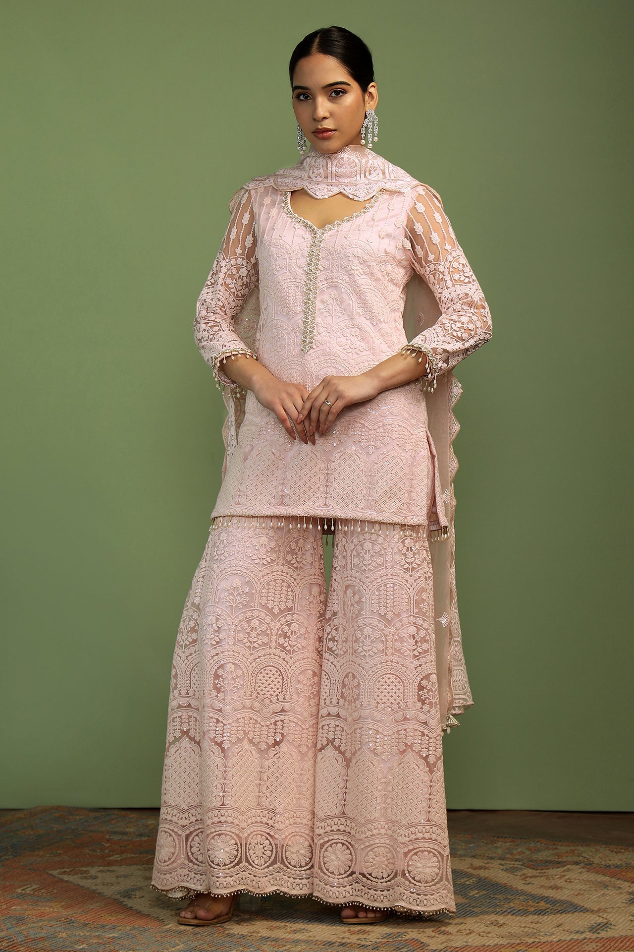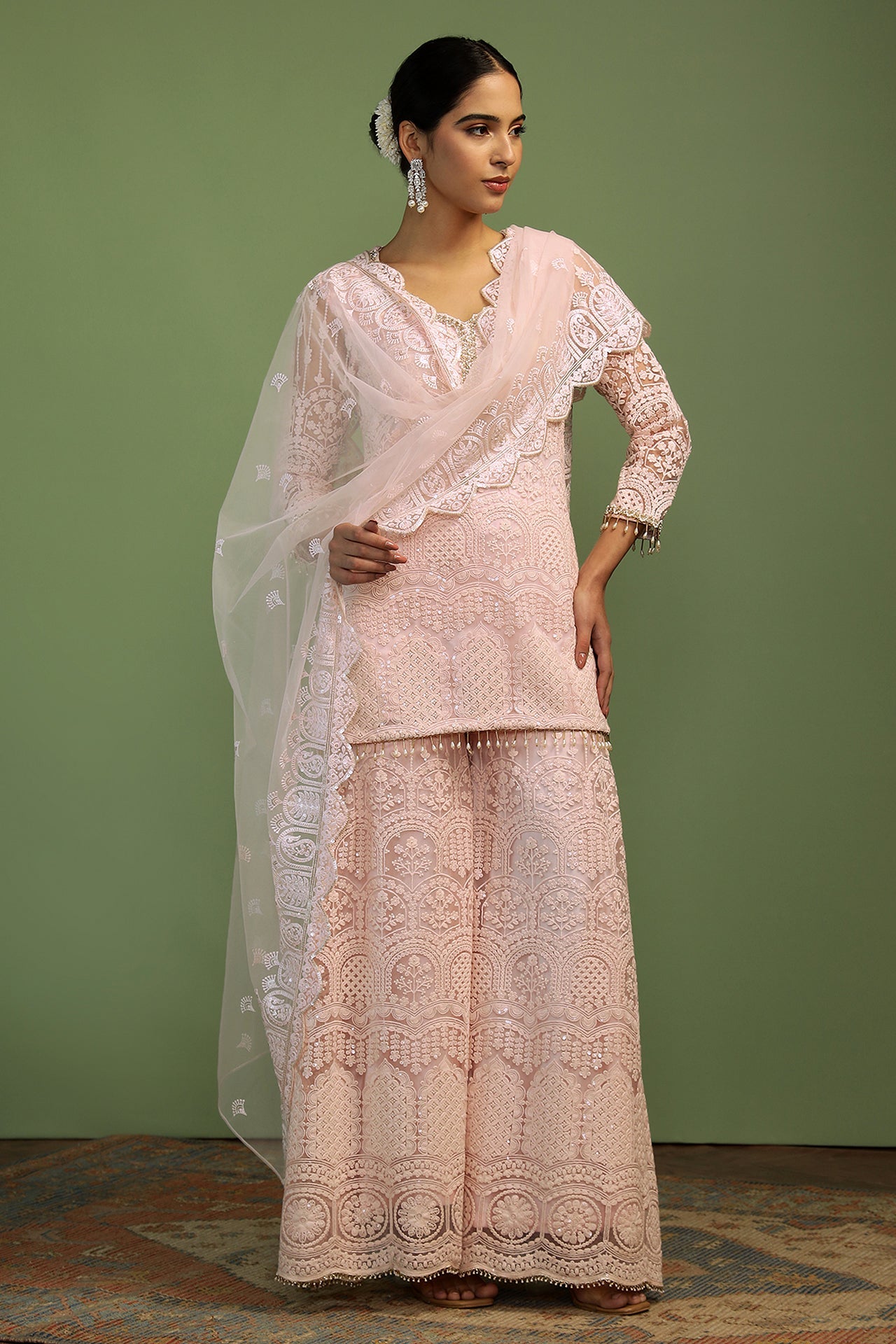 This princess like, sophisticated set features beautiful threadwork with subtle sequin work detailing. The outfit is lined in rich satin. The pearls accentuate the neck, and the pretty tassles make this the perfect dreamy outfit you've been looking for! Scalloped edges, pretty net embroidered dupatta, all come together to complete the look.