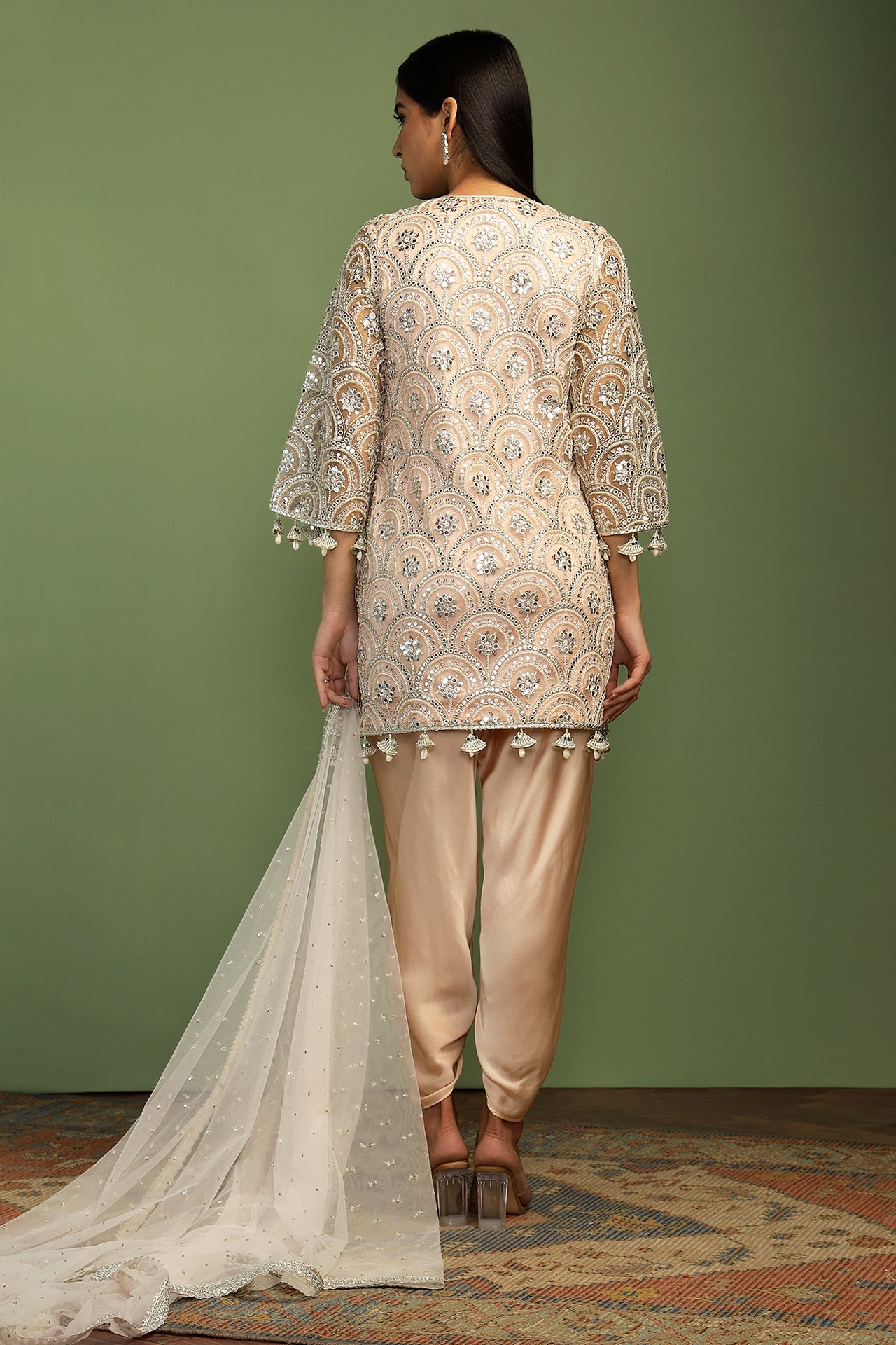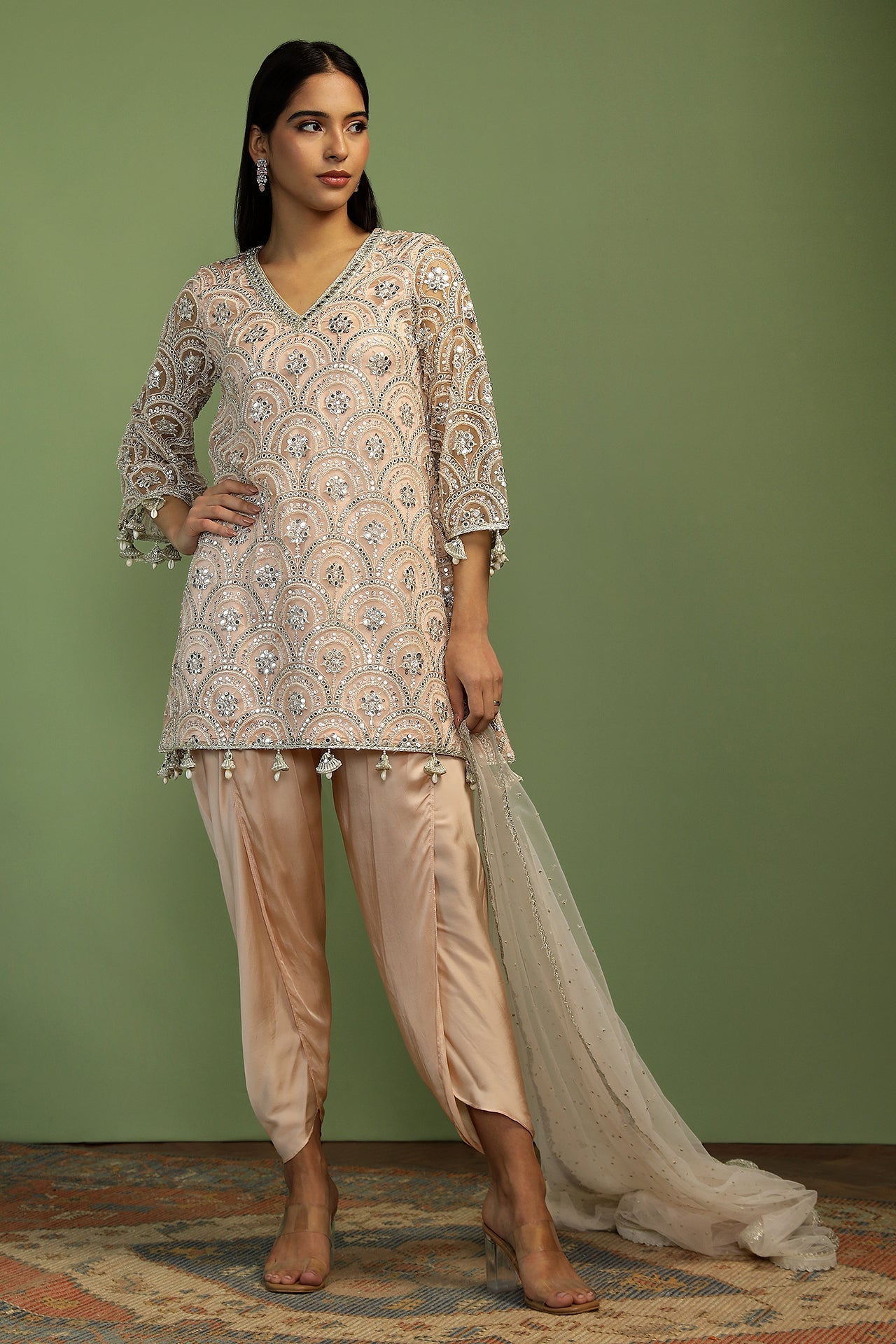 Beatifully embroidered sequin and mirror work kurta, edged with pretty details of shell and pearl, this kurta is made in a simple yet effective A-line shape. The dhoti pants are in soft satin and create the perfect balance. Dupatta is a delicate spread of sequins finished with rich embroidery along the edges. The most dreamy and elegant style of the season!