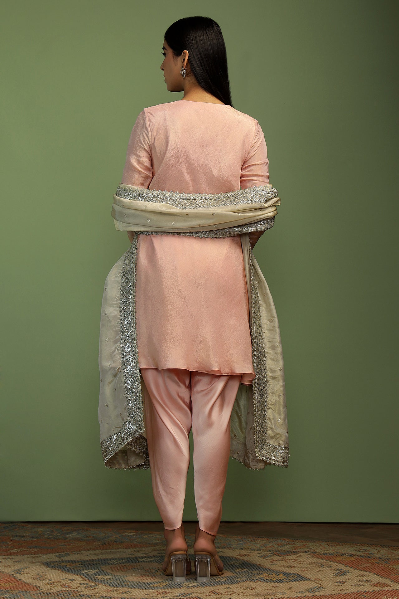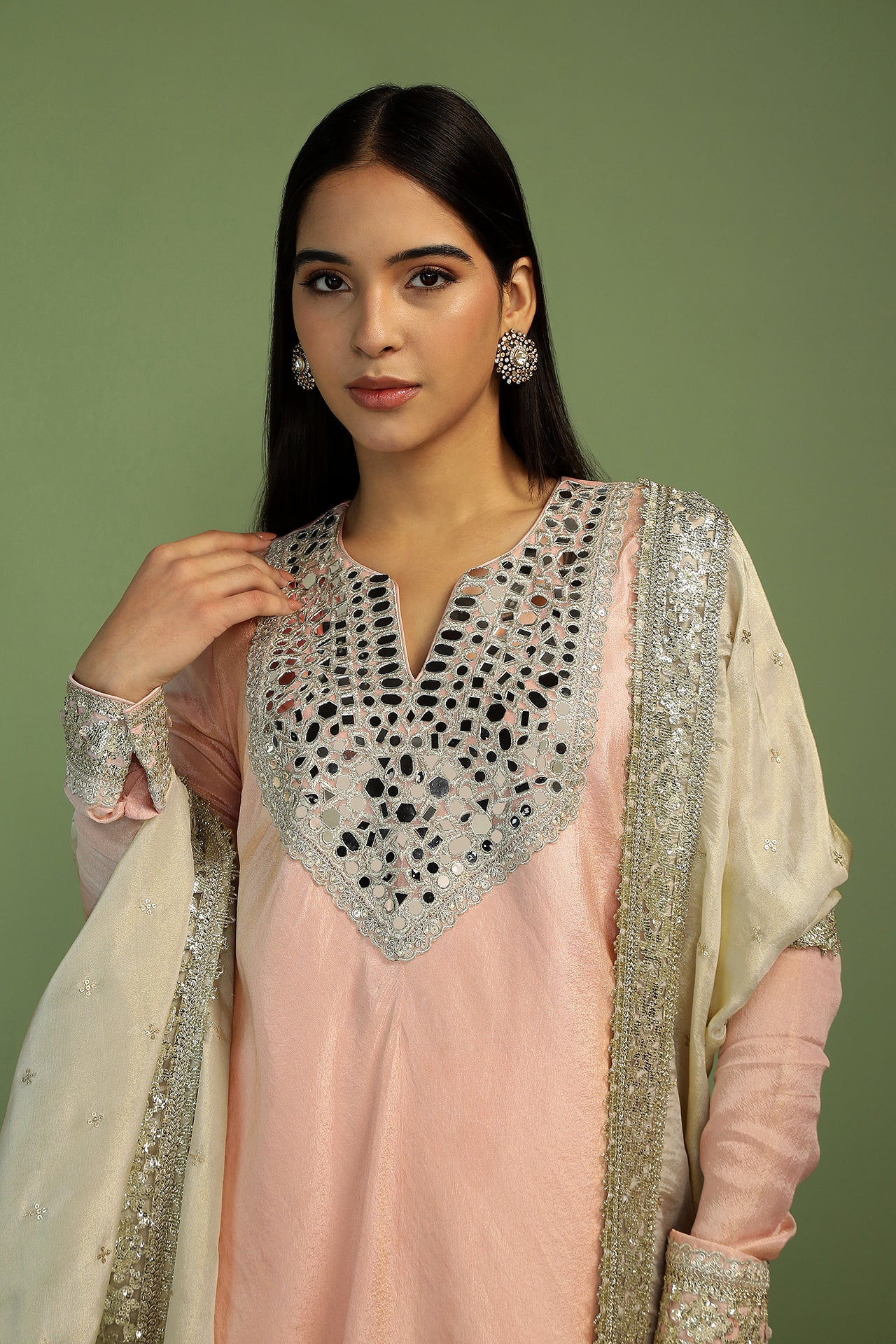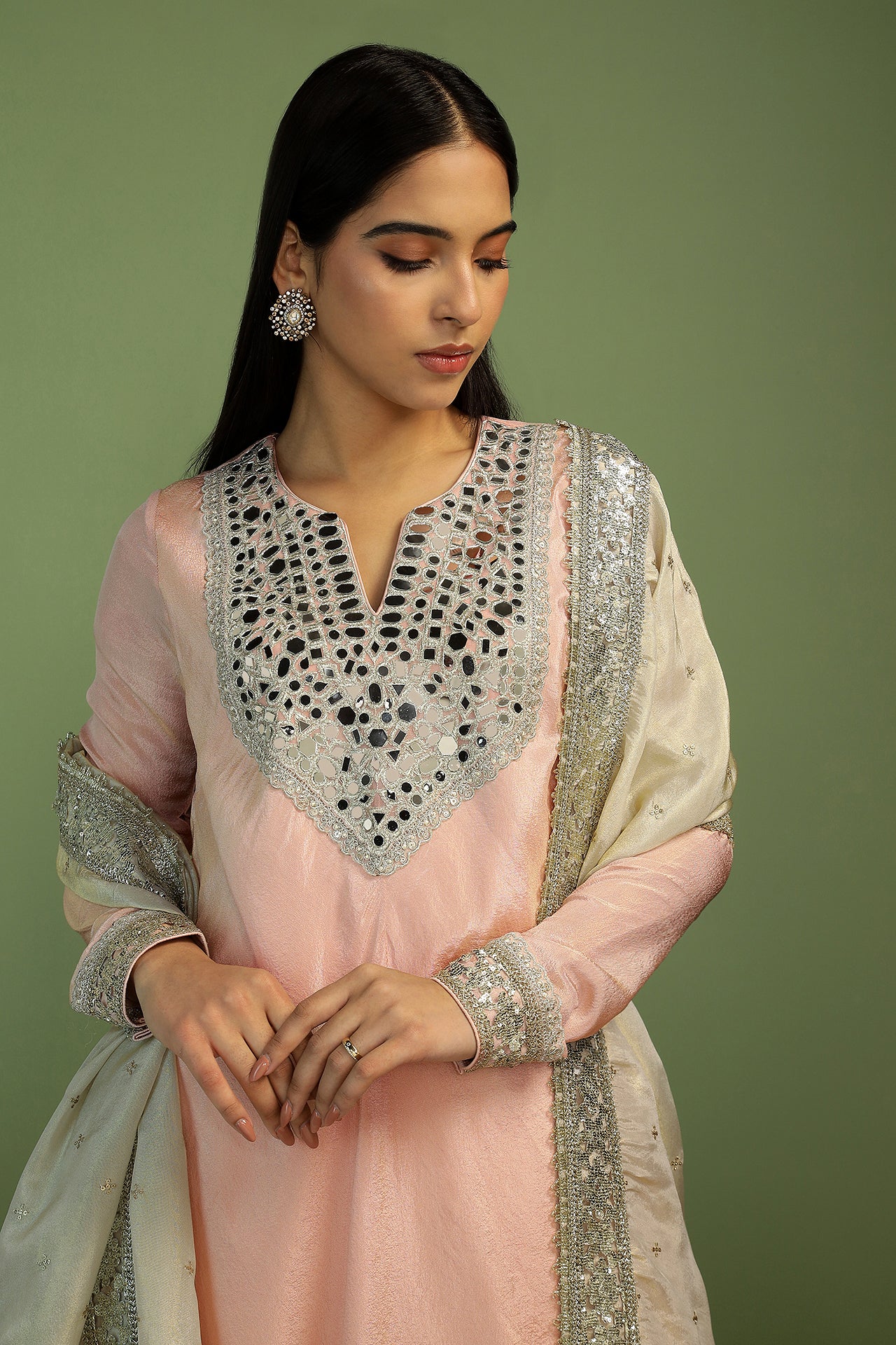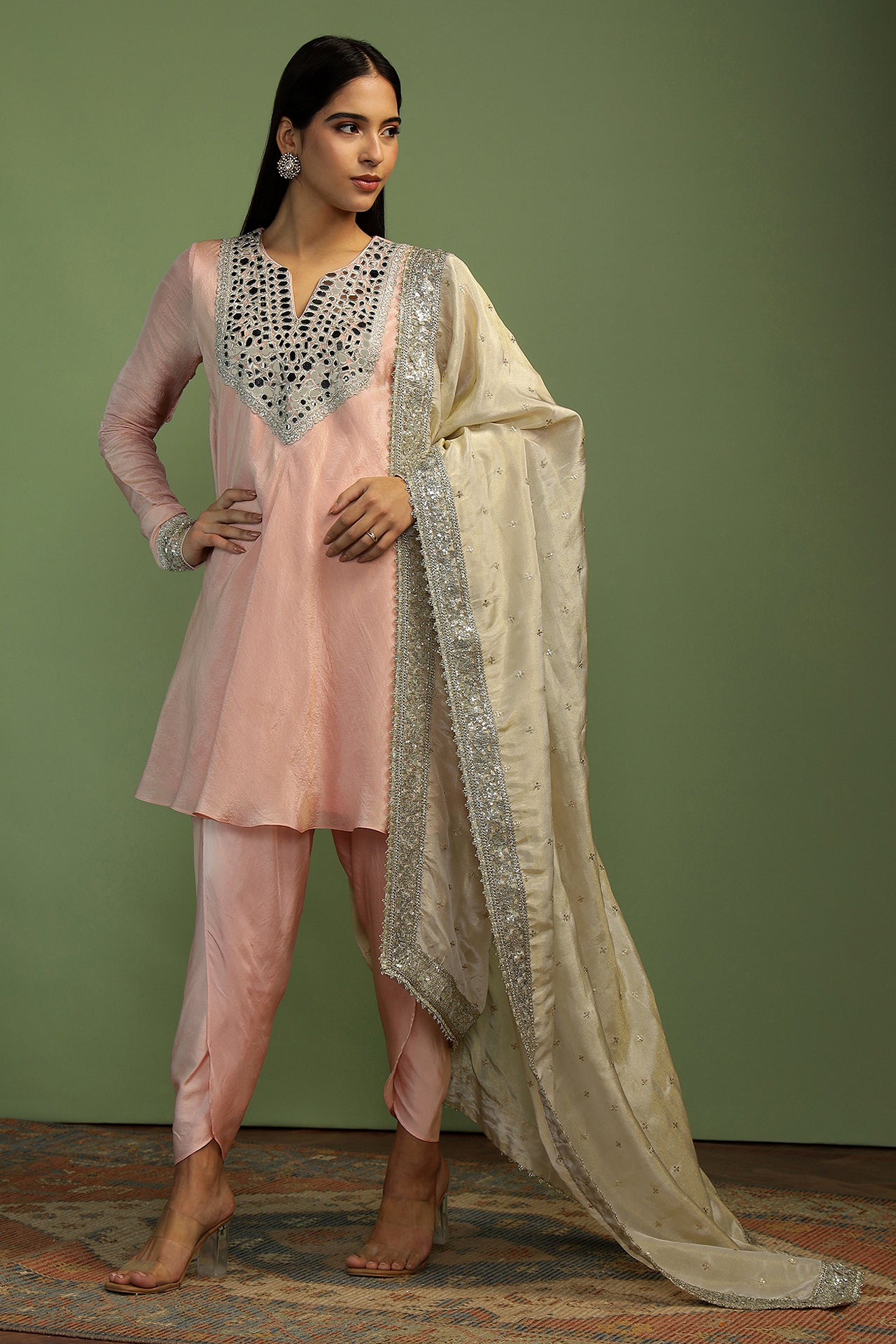 A stunning ensemble in soft and flowy gold tissue. The neck is made of sparkly mirrors adding the perfect amount of glam. The sleeves are long, churi style with delicate embroidery on the cuffs. The kurta is a light and easy bias shape. Teamed with soft dhoti pants, and a rich contrast gold tissue and sequin dupatta, make this your favourite outfit of the season!