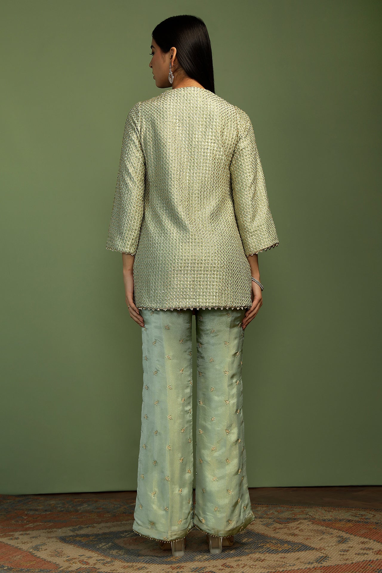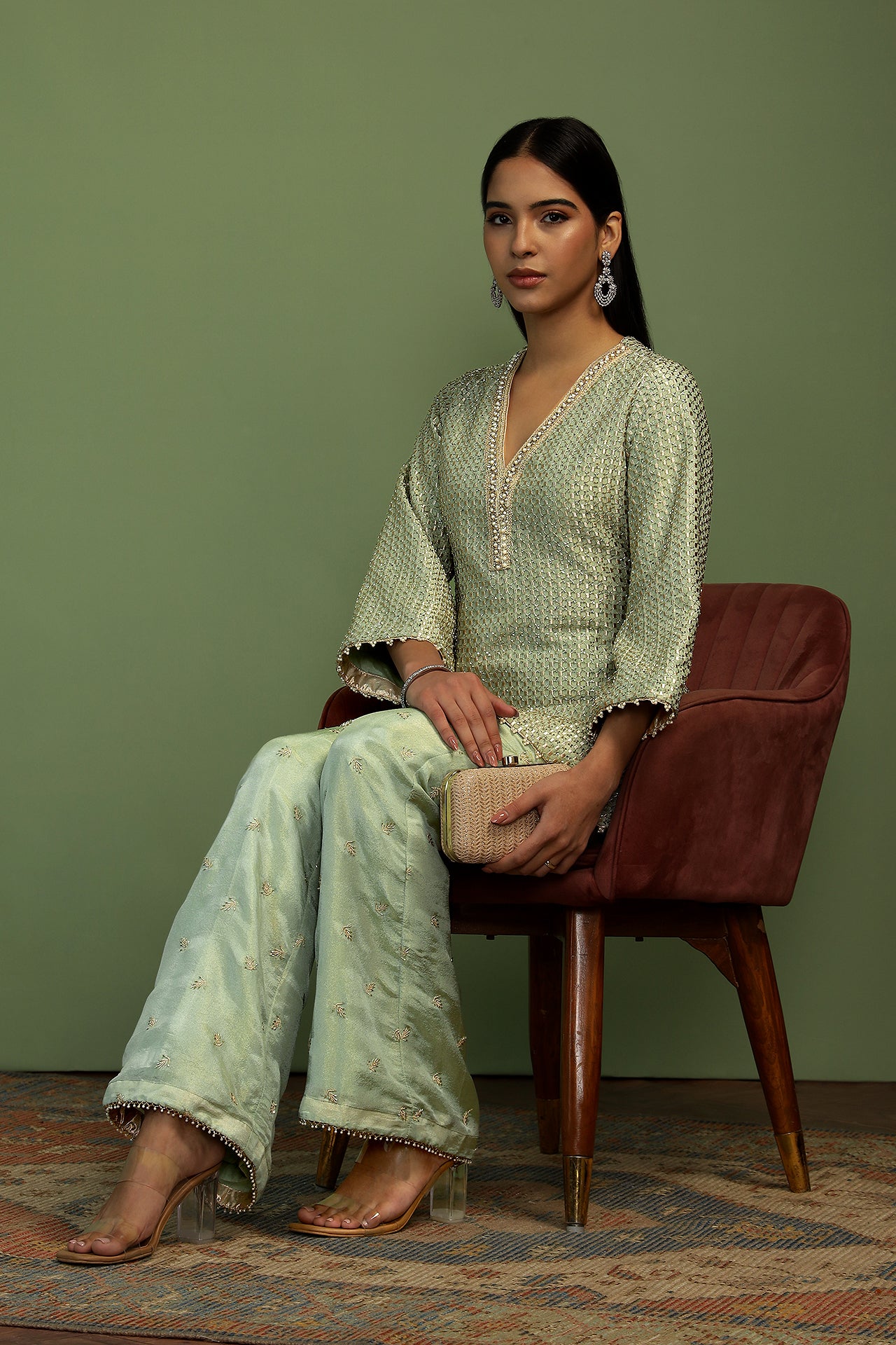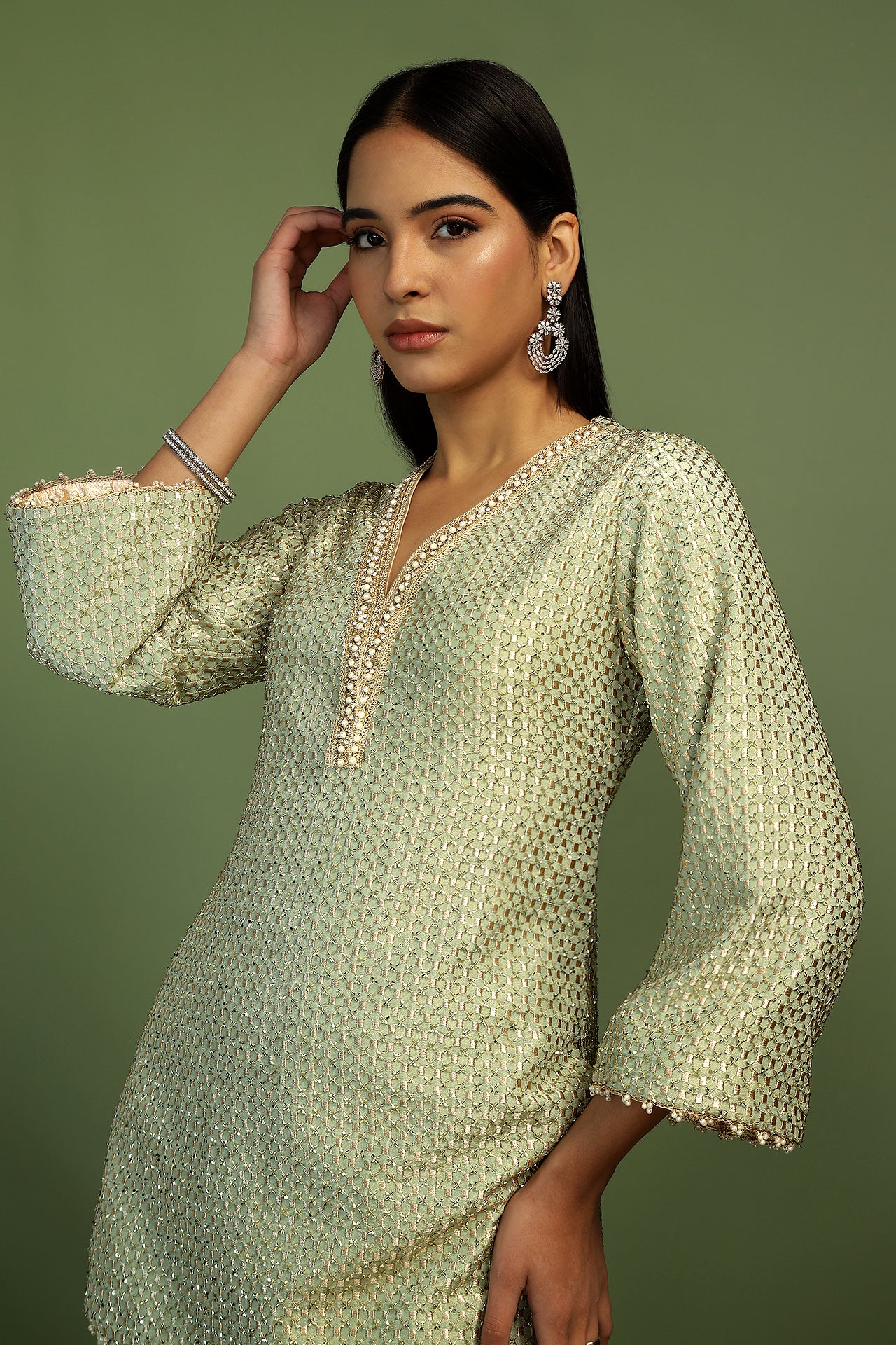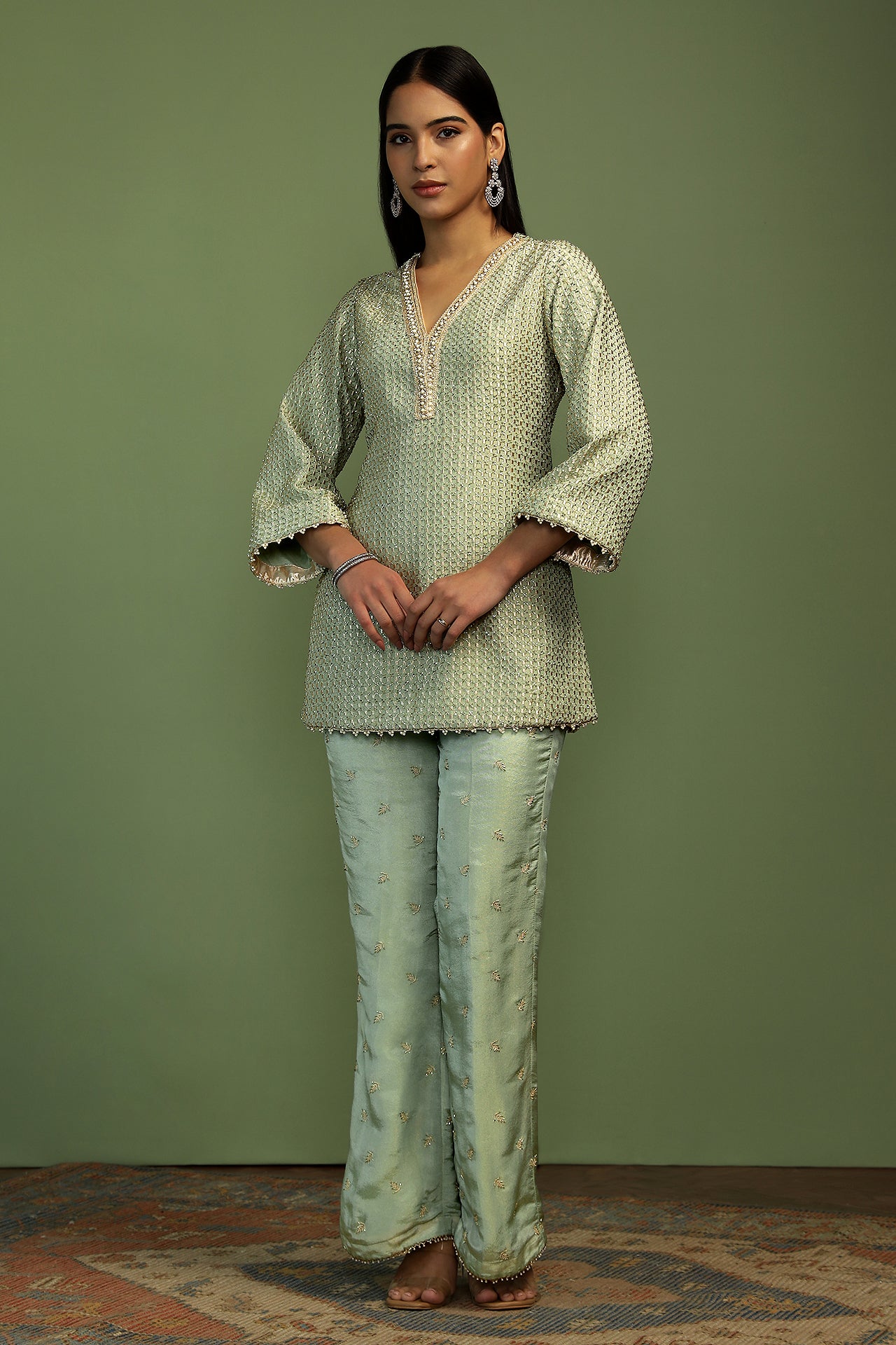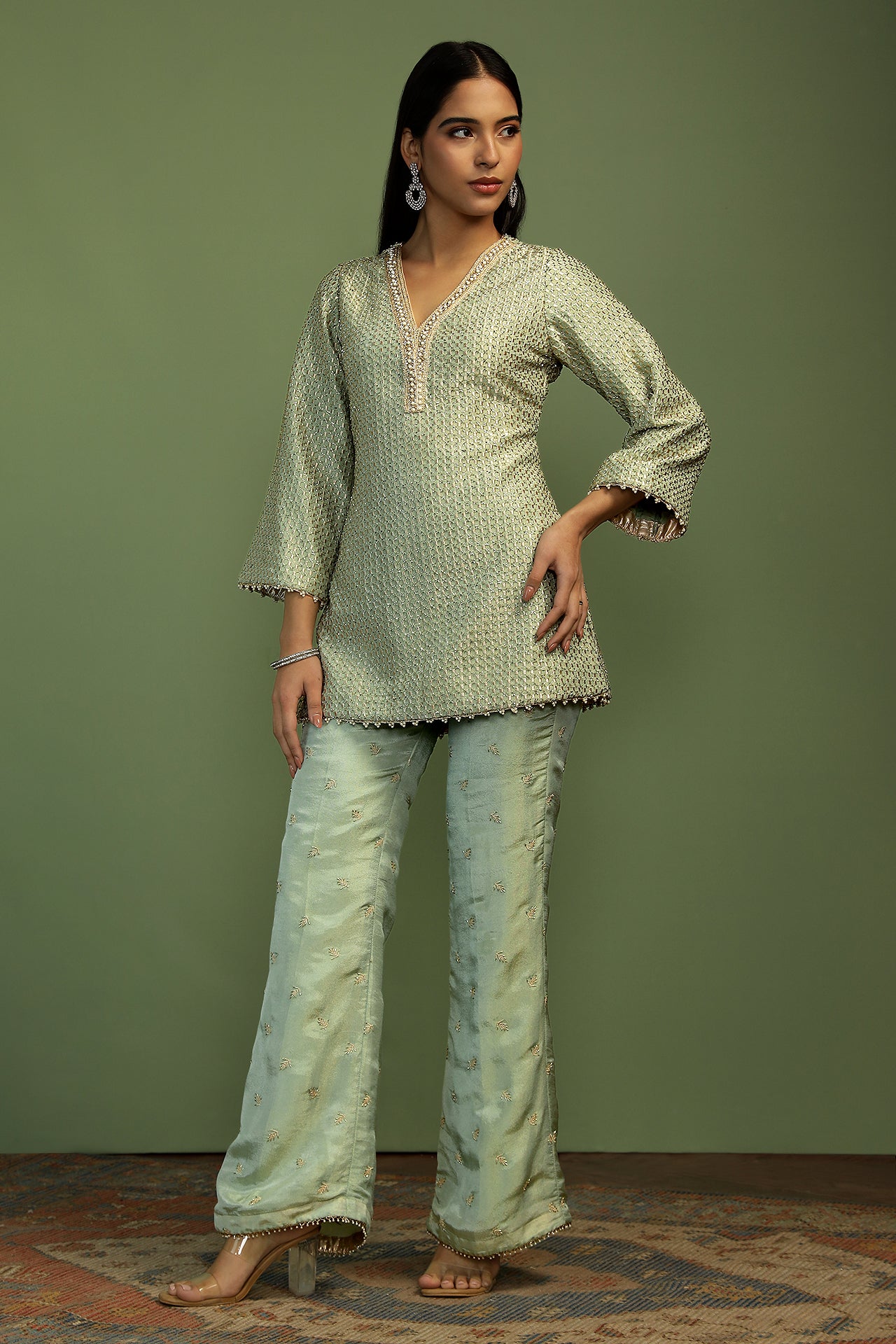 This set features a delicate and glittery kurti with gota and pearl details on a delicate gold tissue base. The neck is accentuated with pretty pearls. The pants are embroidered with a sprinkle of beads and zari on gold tissue. Simple and sophisticated, this could be your next go to outfit!