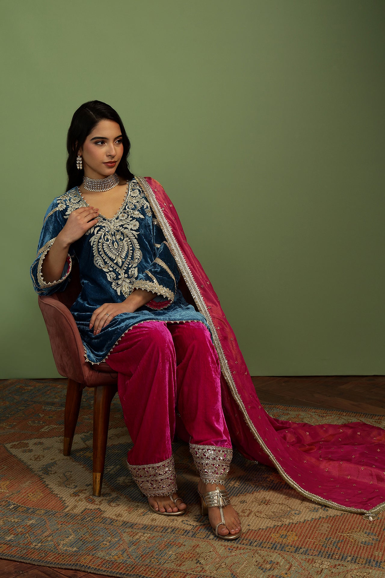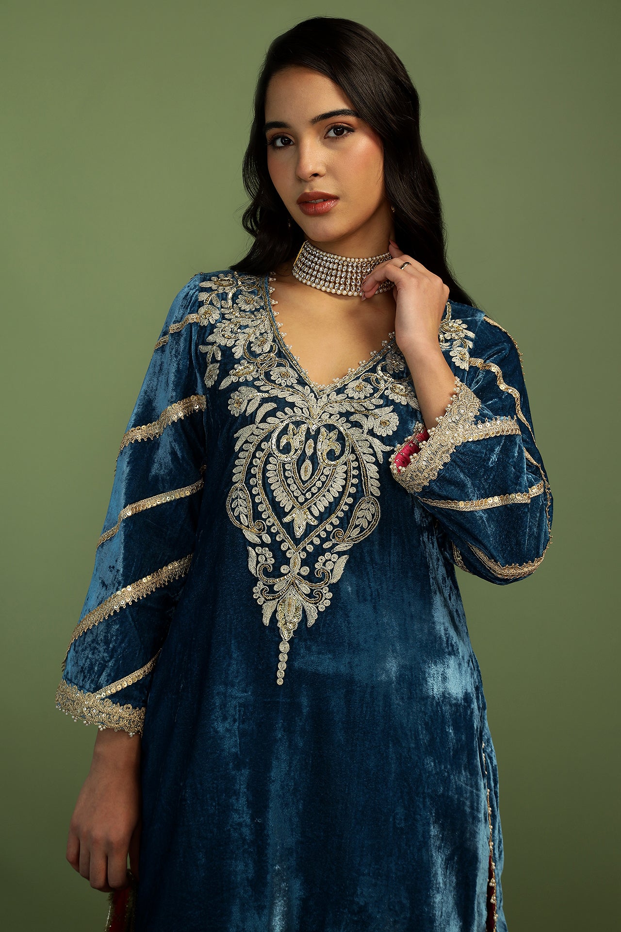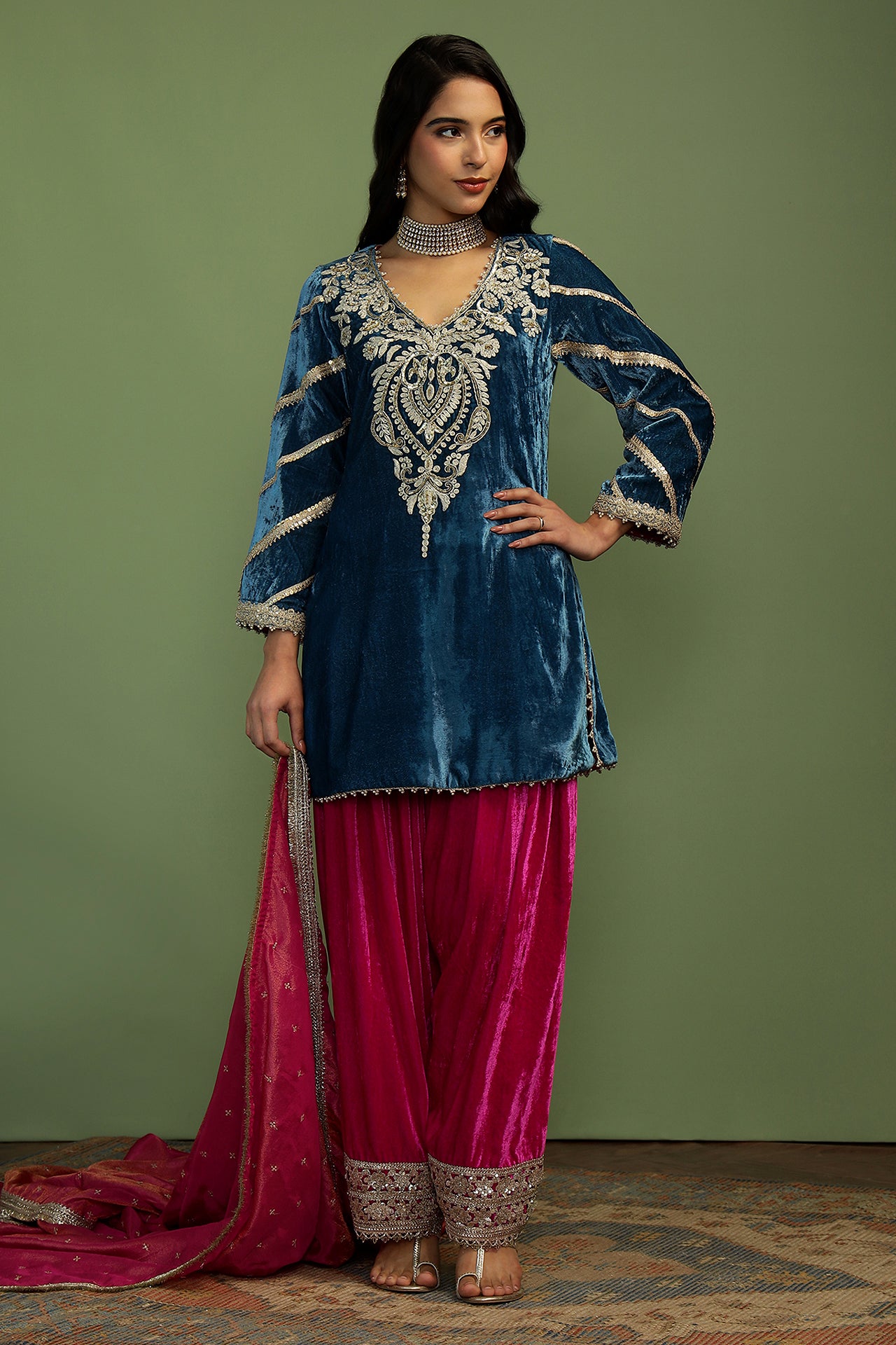 Short velvet kurta in rich, festive hues is what everyone needs to brighten up a cold winter day! The neck features beautiful hand embroidery, with pearl and gota details all over the kurta. The farshi salwar is in a contrast colour with beautiful sequin details on the bottom. Dupatta in rich gold sequins on a tissue base, completes the look with the delicate gold details.