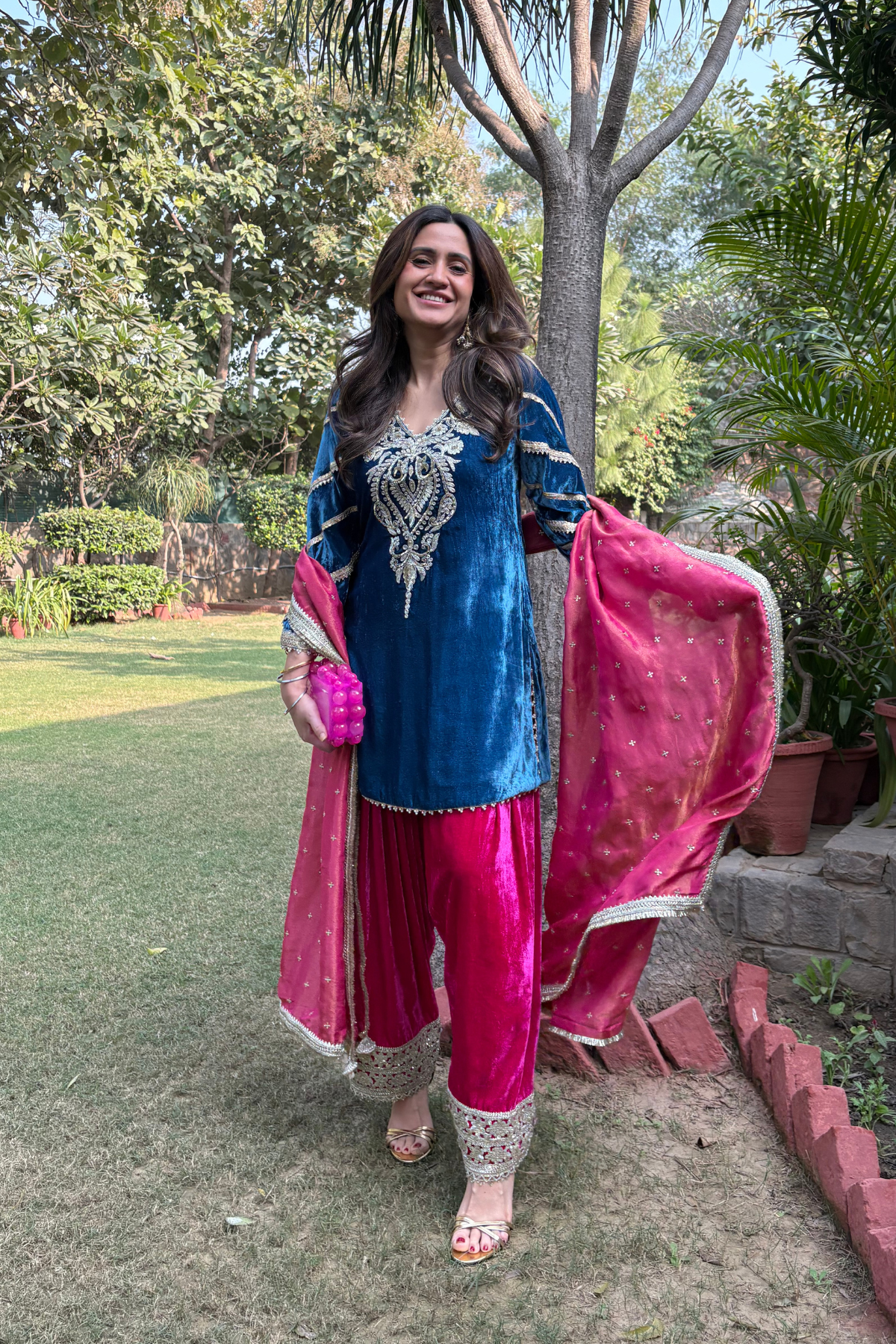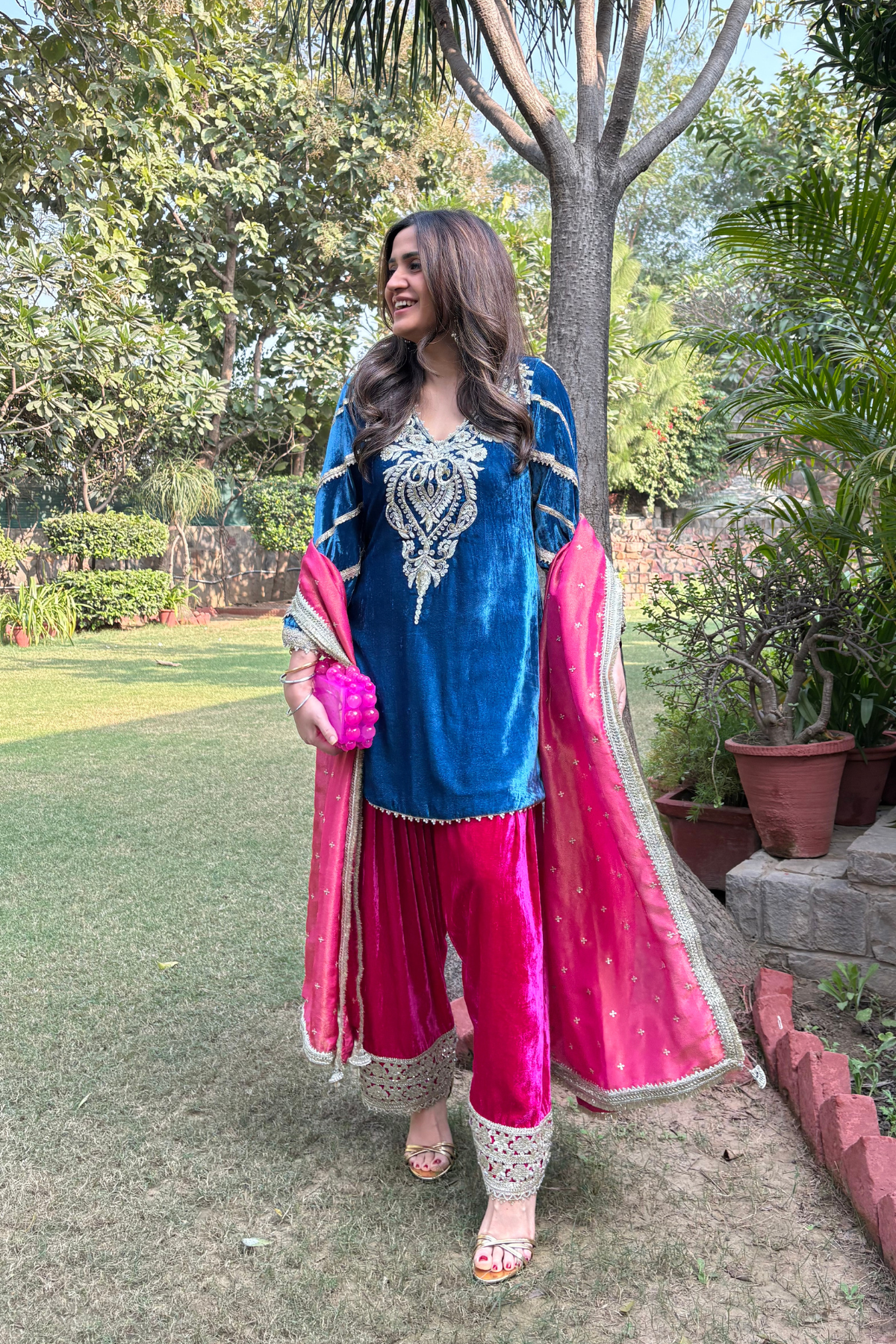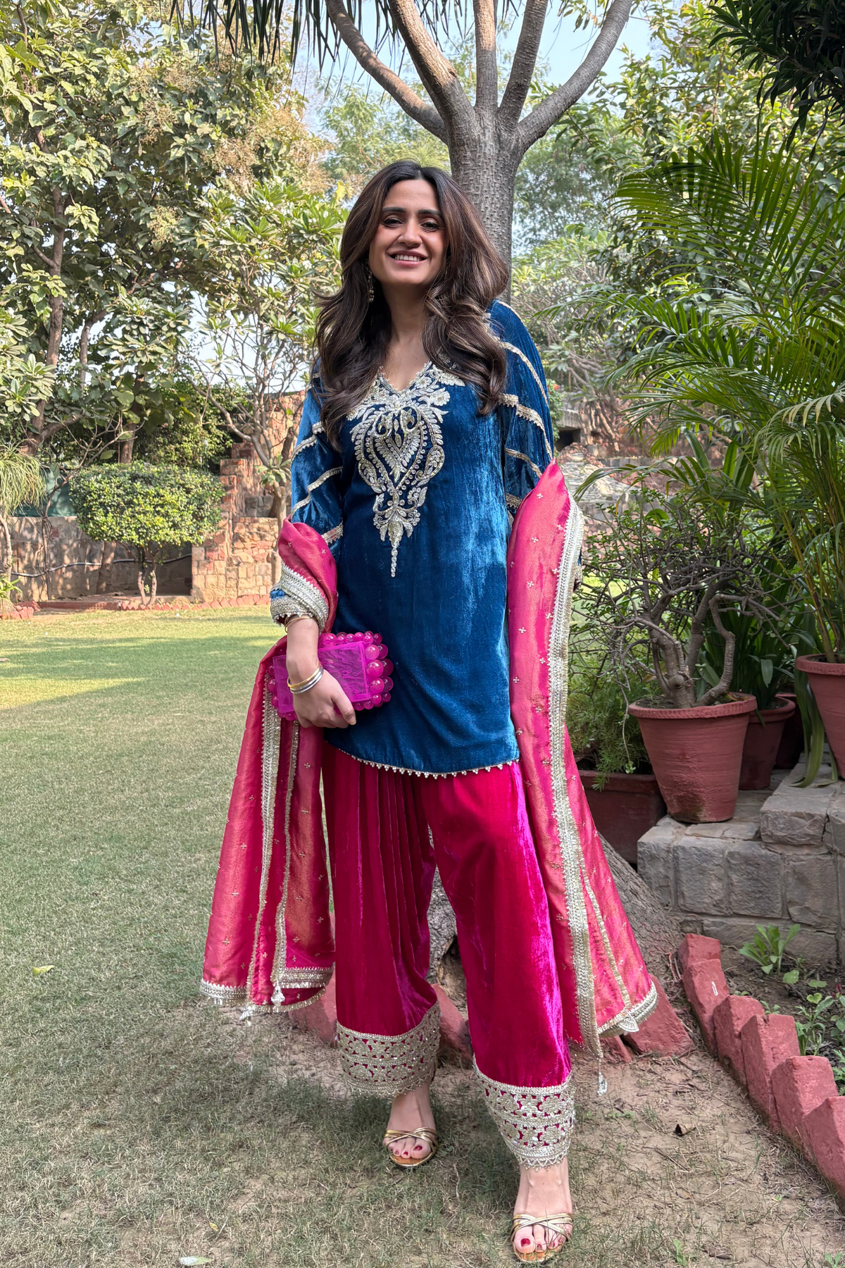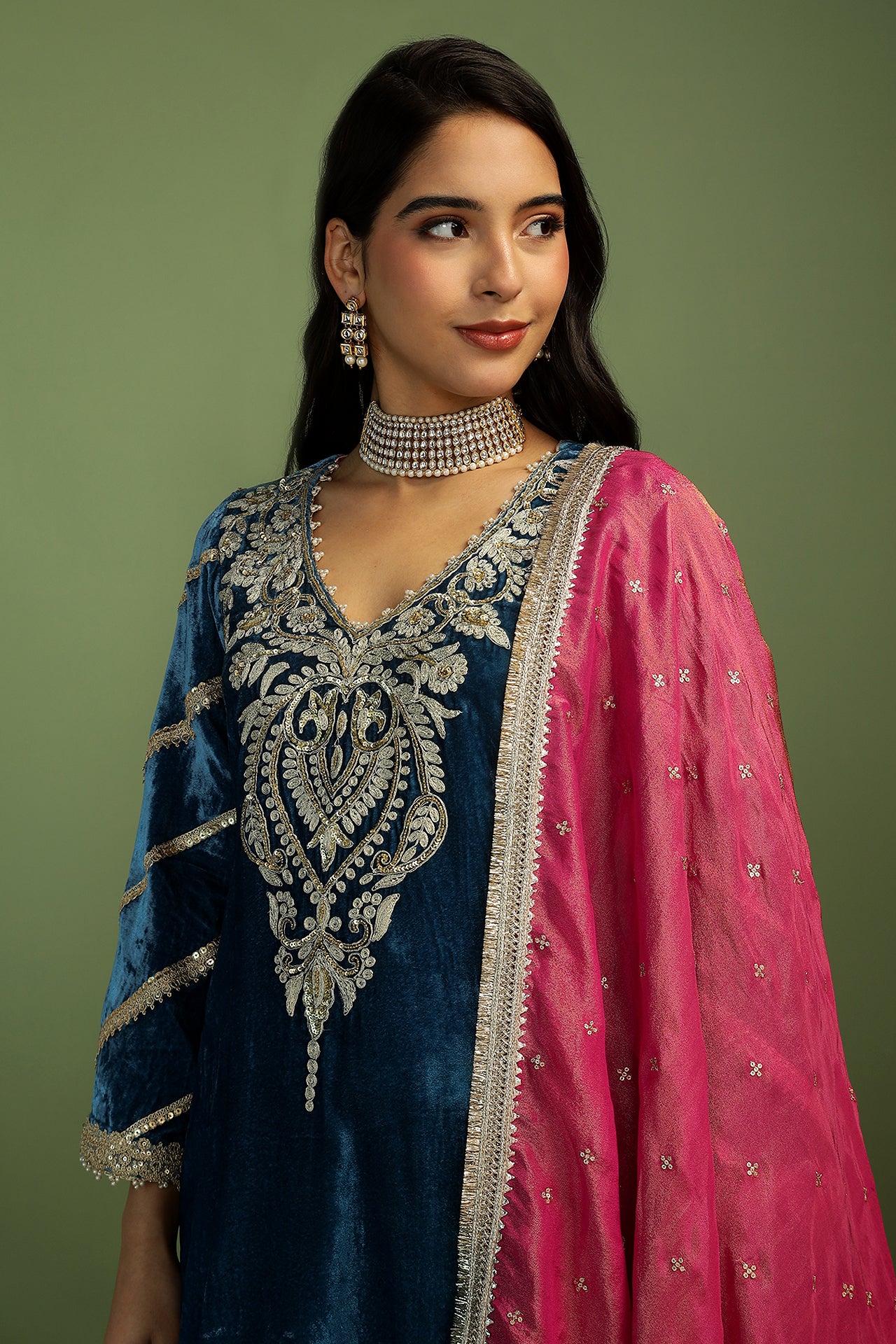 Short velvet kurta in rich, festive hues is what everyone needs to brighten up a cold winter day! The neck features beautiful hand embroidery, with pearl and gota details all over the kurta. The farshi salwar is in a contrast colour with beautiful sequin details on the bottom. Dupatta in rich gold sequins on a tissue base, completes the look with the delicate gold details.