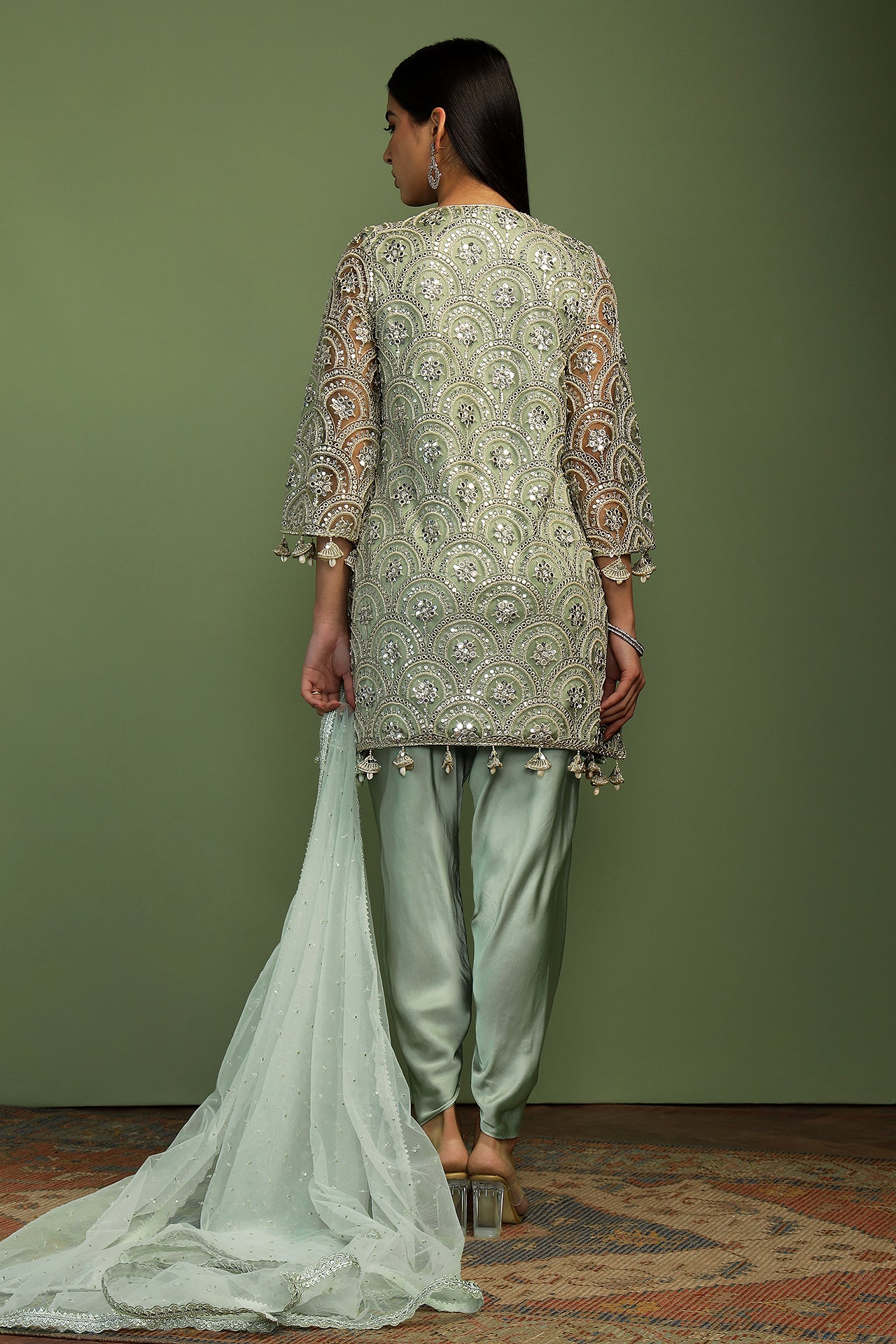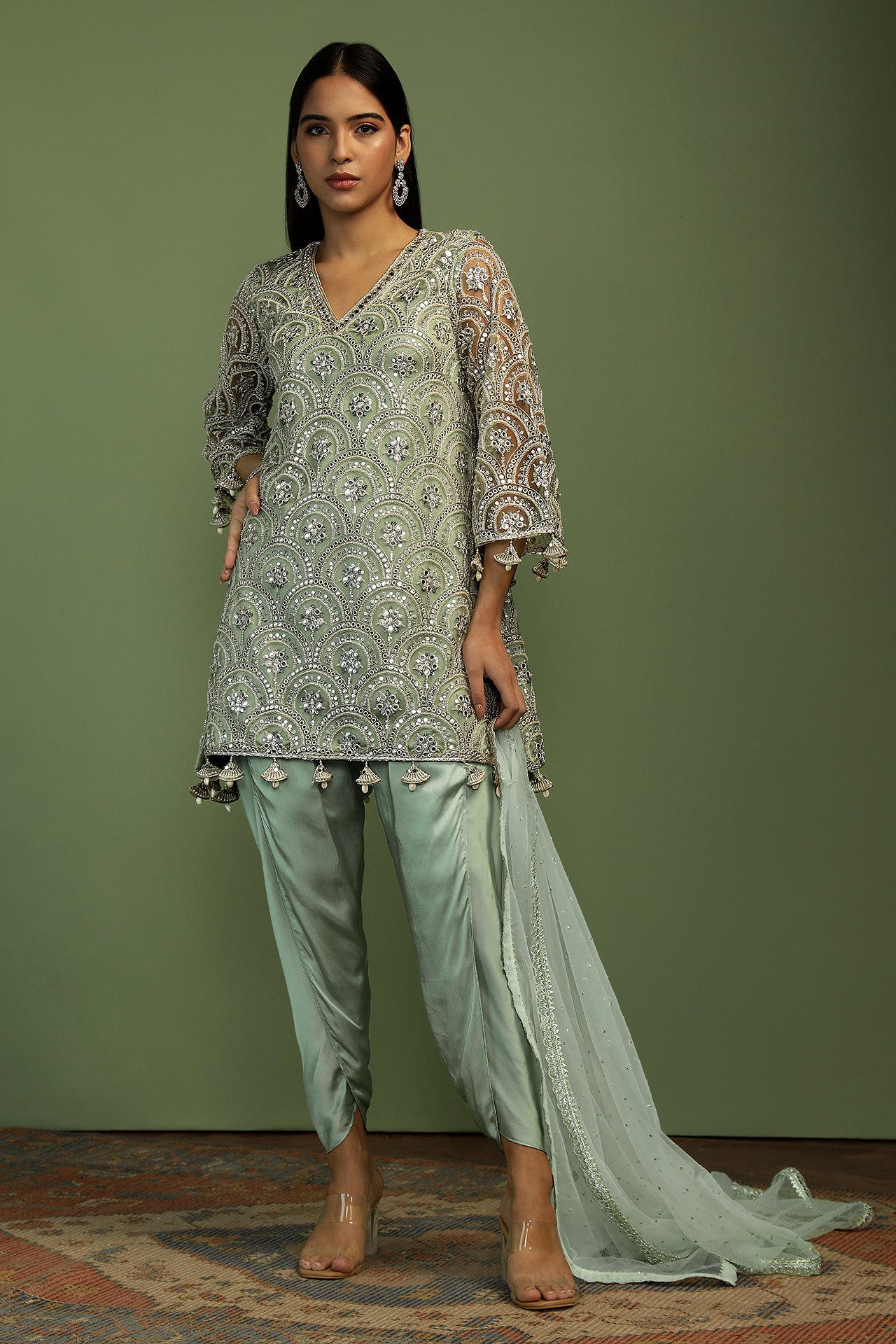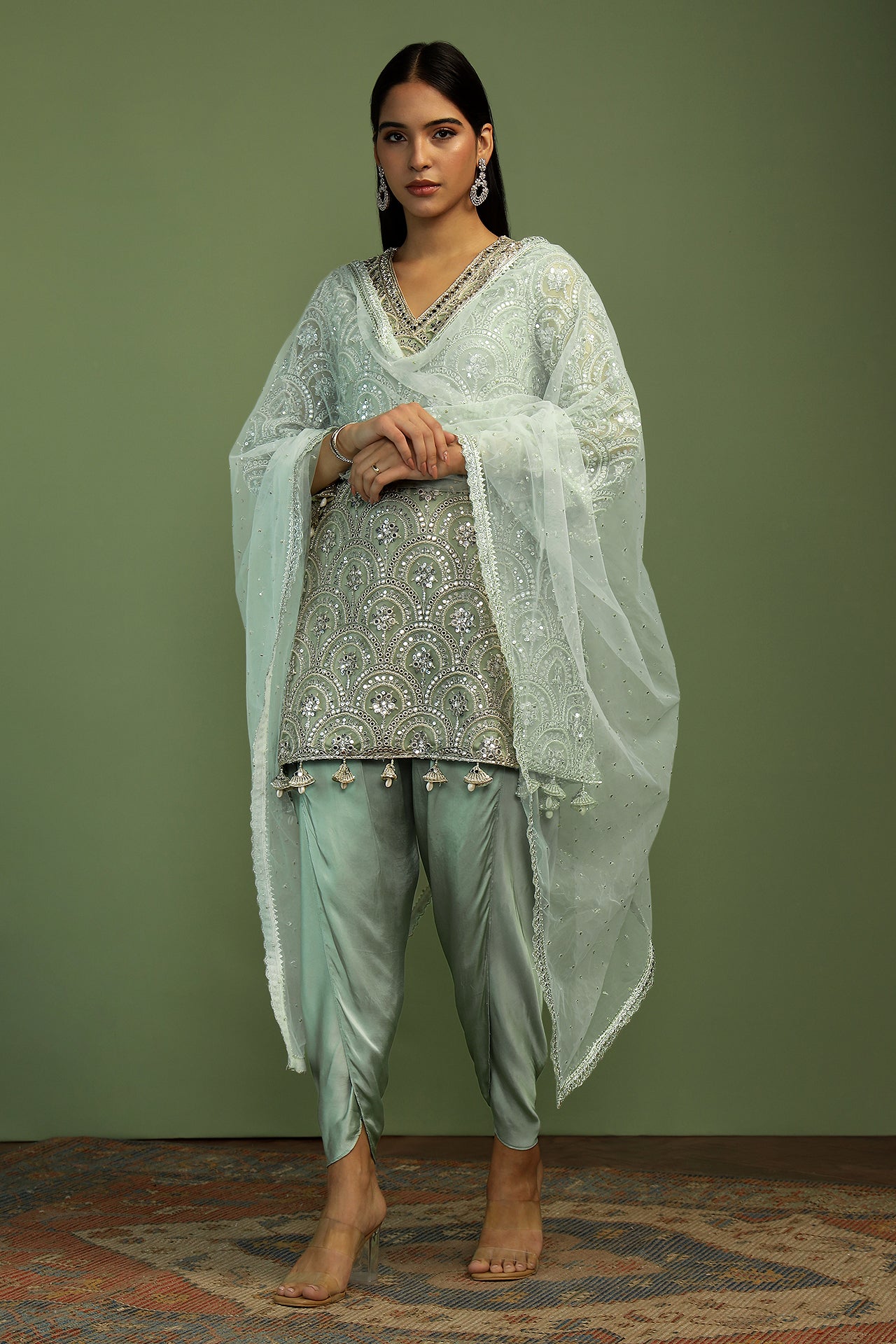 Beatifully embroidered sequin and mirror work kurta, edged with pretty details of shell and pearl, this kurta is made in a simple yet effective A-line shape. The dhoti pants are in soft satin and create the perfect balance. Dupatta is a delicate spread of sequins finished with rich embroidery along the edges. The most dreamy and elegant style of the season!