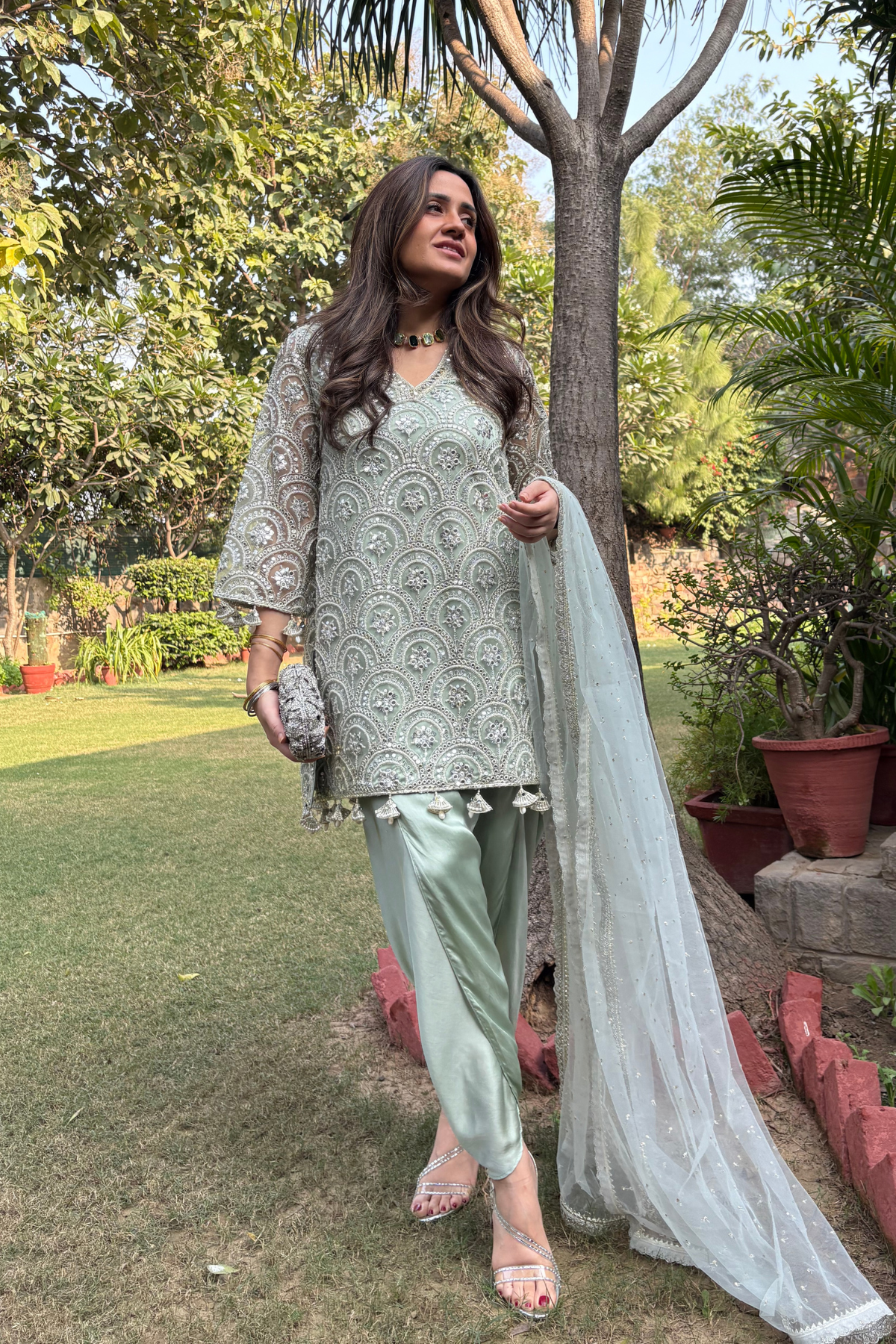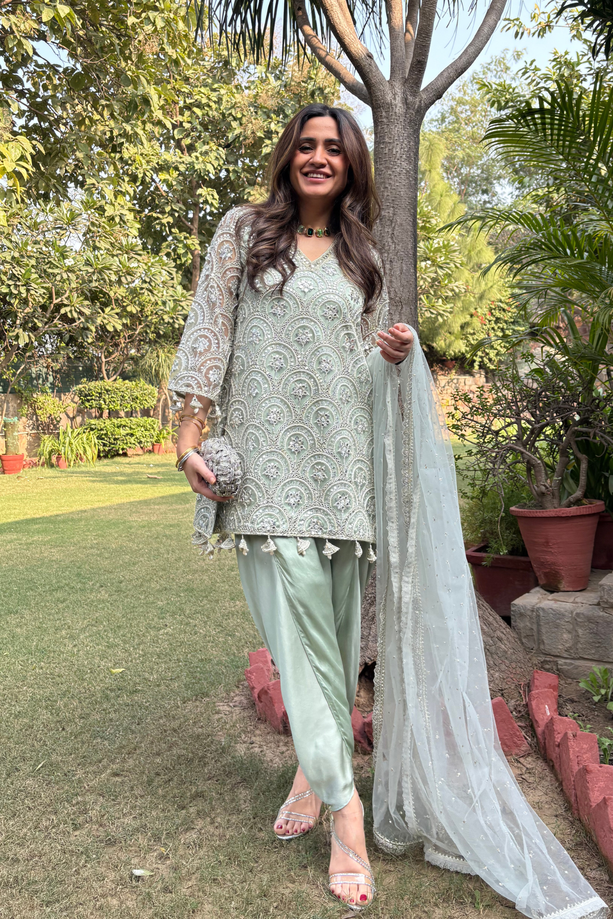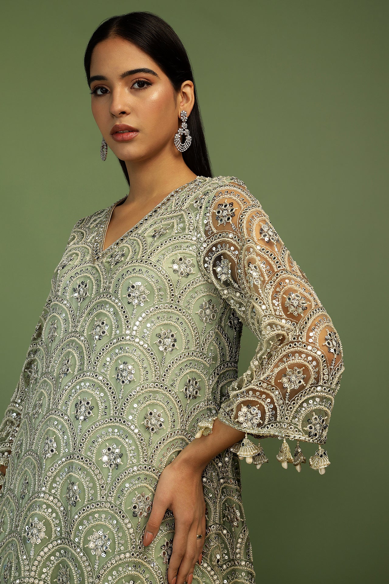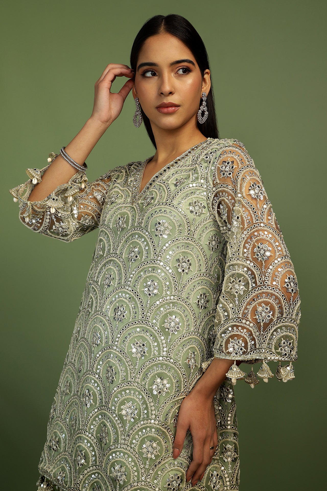 Beatifully embroidered sequin and mirror work kurta, edged with pretty details of shell and pearl, this kurta is made in a simple yet effective A-line shape. The dhoti pants are in soft satin and create the perfect balance. Dupatta is a delicate spread of sequins finished with rich embroidery along the edges. The most dreamy and elegant style of the season!